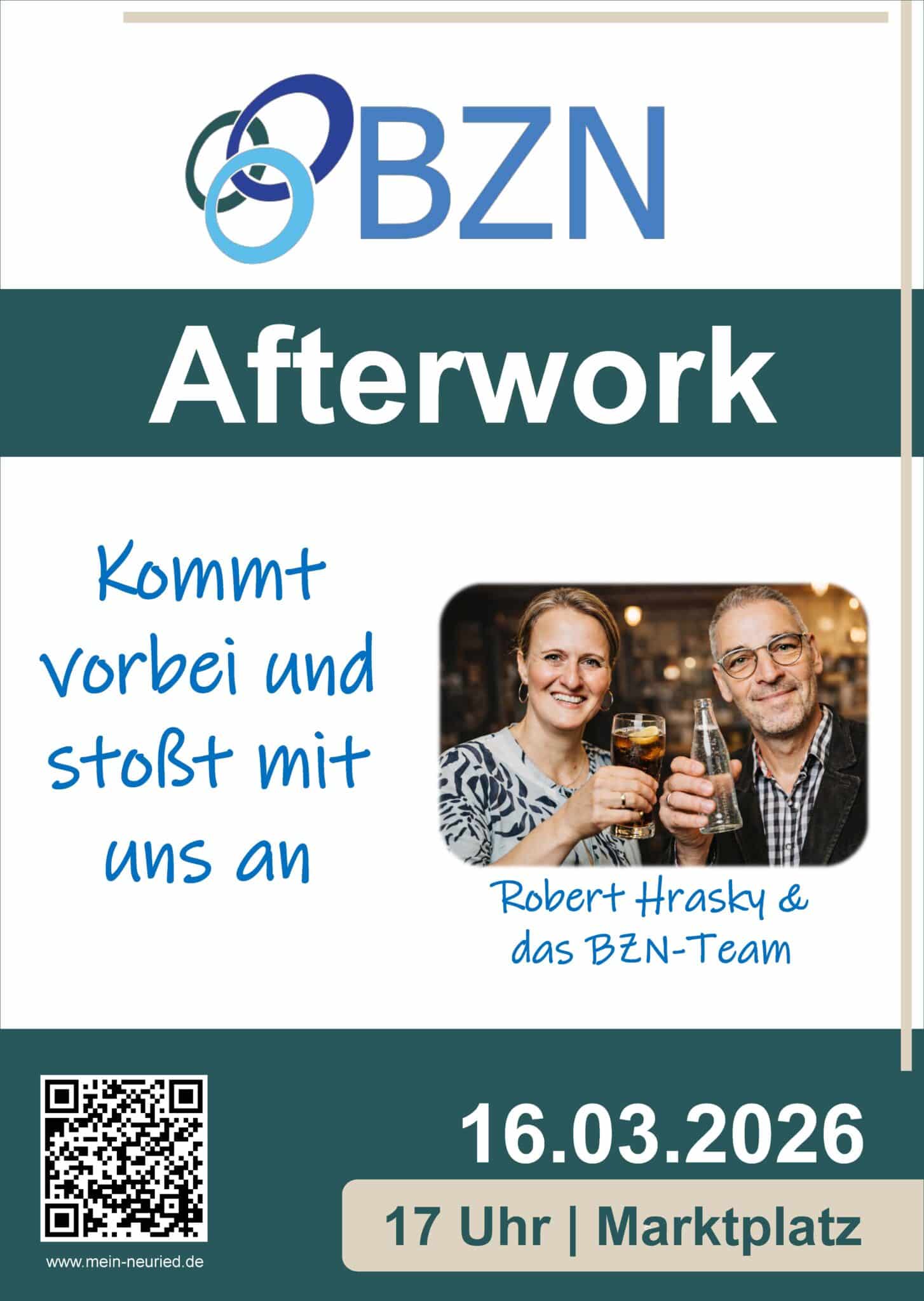 Das BZN lädt ein zur Afterwork am Marktplatz in Neuried. Lasst uns zusammen etwas Zeit verbringen und ohne Politik einfach nur gemeinsam den Feierabend zu genießen. Nach den hektischen Wochen haben wir uns gemeinsam einen chilligen Abend verdient. Wir freuen uns auf Euch!