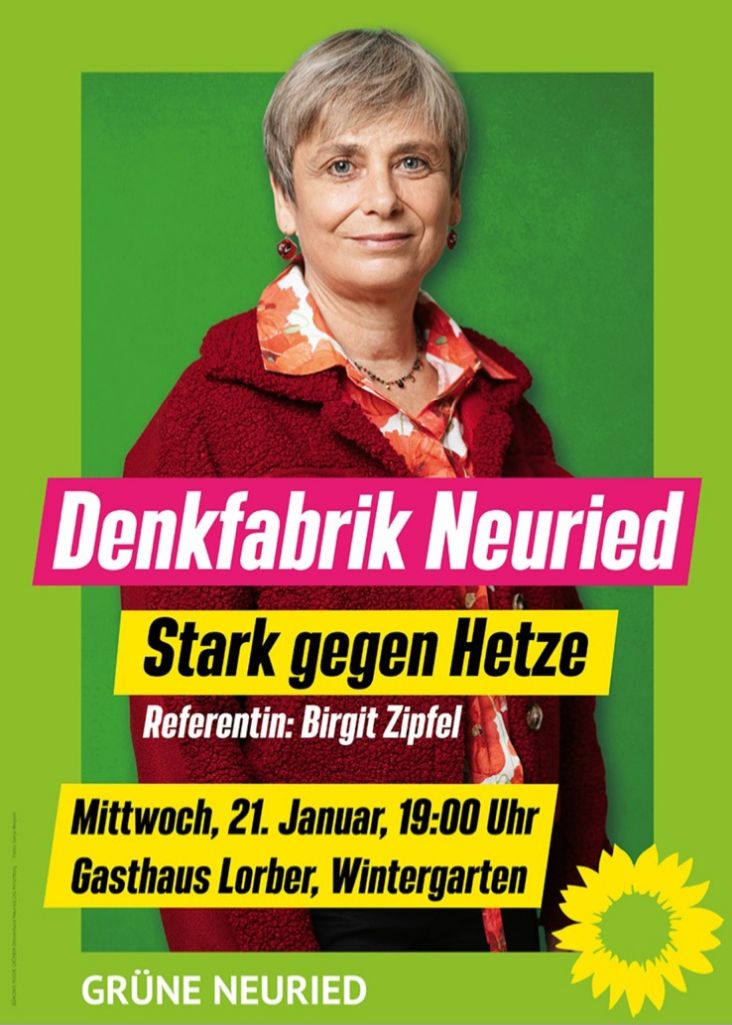 Die Grünen Neuried laden am 21.01.2026 um 19.00 Uhr zur ihrer nächsten Denkfabrik in das Gasthaus Lorber (Wintergarten) ein. Die ausgebildete Mediatorin Birgit Zipfel, Mitglied der GRÜNEN-Fraktion im Neurieder Gemeiderat, stellt einfache Strategien vor, wie man Hass und Hetze in die Schranken weist und cool und dennoch klar auf sogenannte Stammtischparolen reagiert.