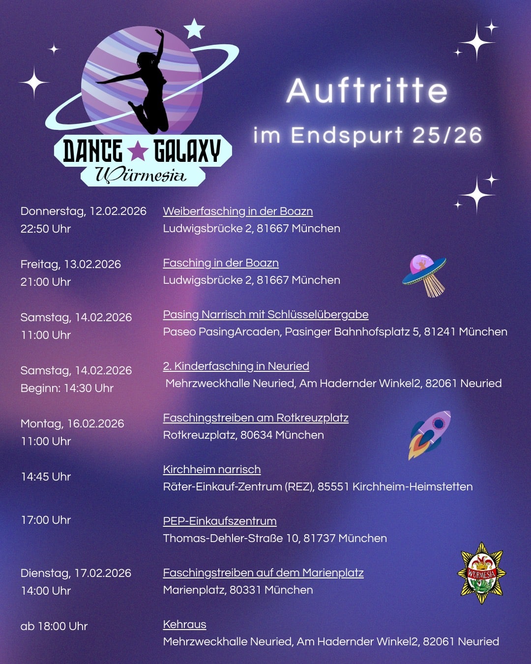 Bis dahin sind wir bereits ab Donnerstag, den 12.02. mit unserer Show in und um München auf Tour, schauen Sie vorbei!